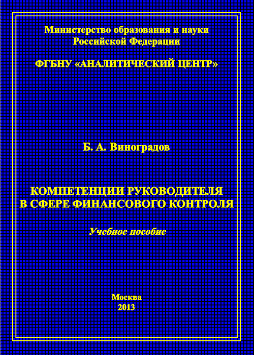 Год публикации: 2013 Виноградов Б. А. Компетенции руководителя в сфере финансового контроляУчебное пособие – М.: ФГБНУ «Аналитический центр» Минобрнауки России, 2013. – 204 с. (ISBN 978-5-904670-22-1).