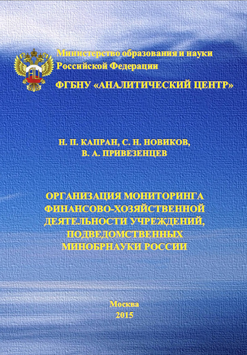 Год публикации: 2015 Капран Н. П. Организация мониторинга финансово-хозяйственной деятельности учреждений, подведомственных Минобрнауки РоссииМонография / Н. П. Капран, С. Н. Новиков, В. А. Привезенцев; под науч. ред. А. И. Володина. – М.: ФГБНУ «Аналитический центр» Минобрнауки России, 2015. – 92 с. (ISBN 978-5-904670-31-3).