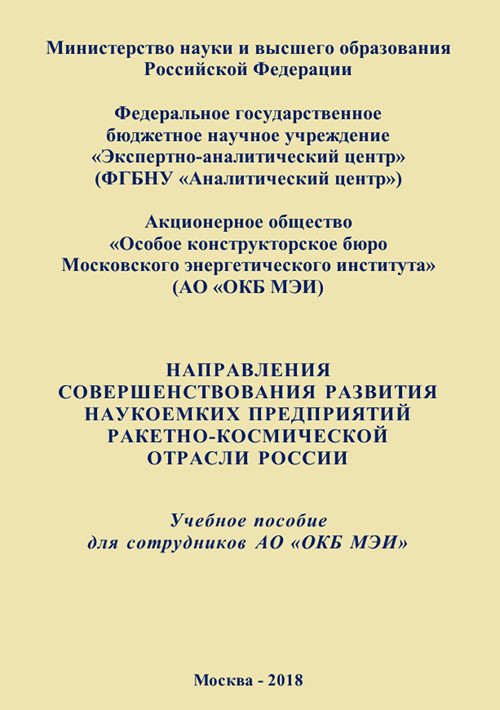 Год публикации: 2018 Направления совершенствования развития наукоемких предприятий ракетно-космической отрасли РоссииУчебное пособие для сотрудников АО «ОКБ МЭИ» / А. С. Чеботарев [и др.]; под науч. ред. д-ра техн. наук. проф. А. С. Чеботарева. – М.: ФГБНУ «Аналитический центр» Минобрнауки России, 2018. – 145 с. (ISBN 978-5-904670-51-1).