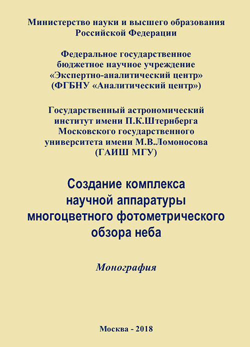 Год публикации: 2018 Создание комплекса научной аппаратуры многоцветного фотометрического обзора небаМонография / А. И. Захаров, А. О. Жуков [и др.]. – М.: ФГБНУ «Аналитический центр» Минобрнауки России, 2018. – 135 с. (ISBN 978-5-904670-52-8).