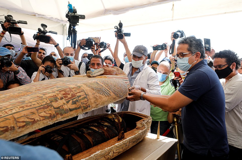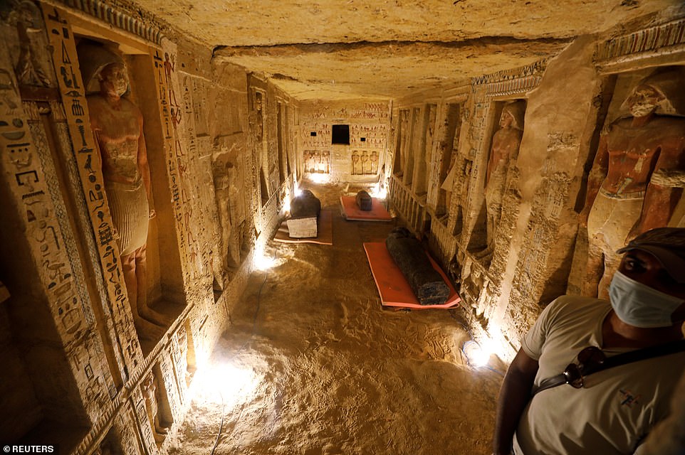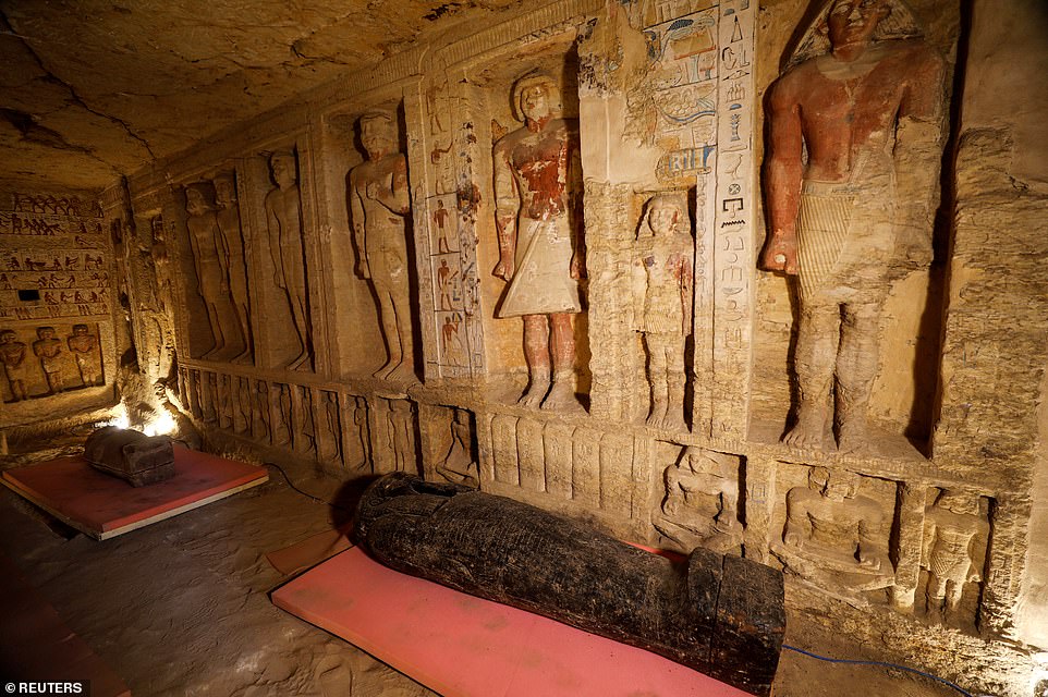 В Саккаре, примерно в 10 милях (16км) к юго-востоку от пирамид Гизы, до сих пор было обнаружено 59 гробов с изображением антропоидов. Около 40 были представлены прессе. В большинстве гробов находились мумифицированные останки, которые, как предполагают первоначальные исследования, могли быть священниками, высшими должностными лицами и представителями элиты древнеегипетского общества. Все они, вероятно, после смерти подверглись сложным погребальным ритуалам Древнего Египта, включая удаление их мозга с помощью железного крючка. Об открытии саркофага объявил министр древностей и туризма Египта доктор Халед Эль-Энани. Он сказал, что миссия начала повторные раскопки на этом месте два месяца назад и обнаружила могильную шахту глубиной 36 футов (10,97 см). Внутри нашли 13 целых гробов. Команда продолжила раскопки, обнаружив еще две шахты - глубиной 32 и 39 футов - также заполненные гробами.