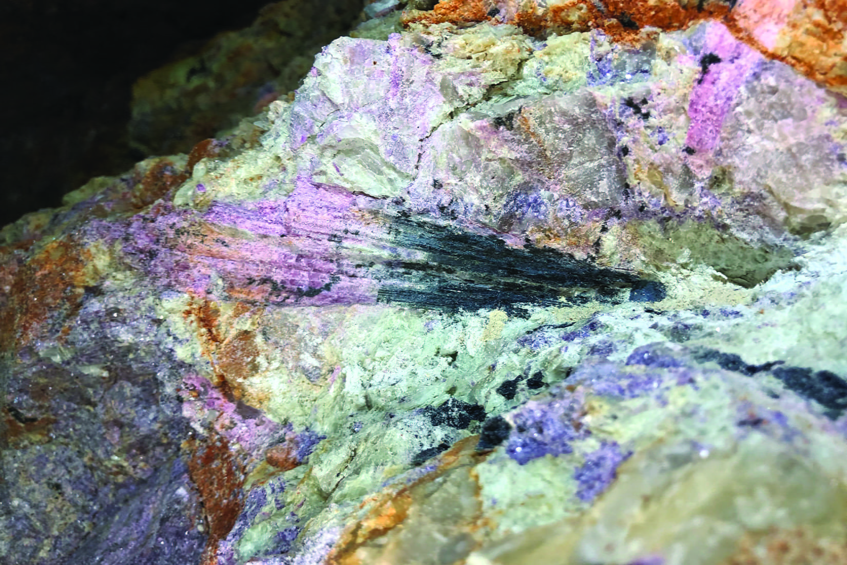 Черный турмалин превращается в розовый турмалин в кварцевом пегматите на калифорнийском руднике Стюарт Лития. (Фото Патрика Фелпса / Университет Райса)/ Источник: news.rice.edu