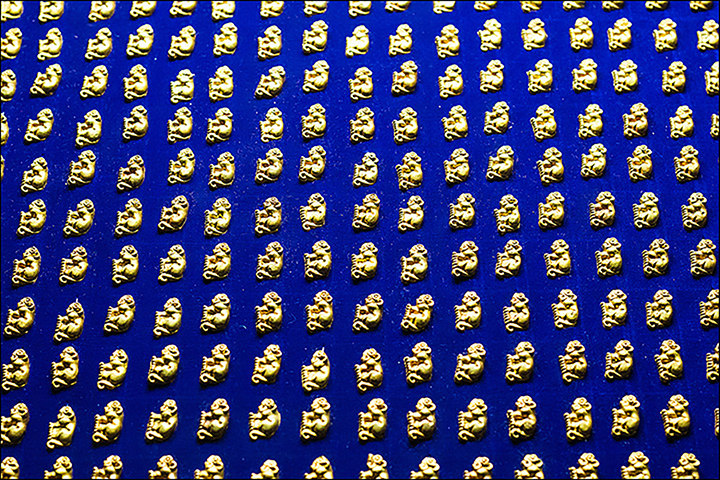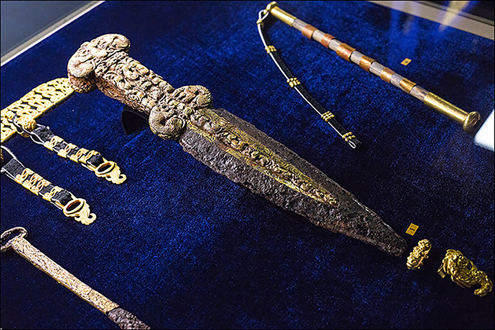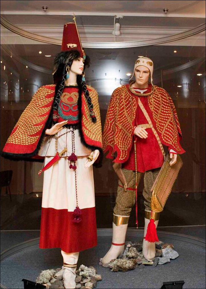 Покрытая двумя слоями бревен из лиственницы, царская погребальная камера была построена как сруб и находилась внутри второй, внешней погребальной камеры той же конструкции. Внутренние стены гробницы были покрыты войлочными коврами. На тщательно обшитом досками деревянном полу - вероятно, смягченном войлоком - лежали тела государя и его спутницы. Древнего правителя похоронили с тяжелым - колье, символизирующем верховную власть, сделанным из чистого золота и украшенным резьбой с животными. Его верхняя одежда была украшена тысячами маленьких золотых фигурок пантер, каждая от 2 до 3 сантиметров в длину, прикрепленных вертикальными рядами, также образующих мотивы, как крылья на его спине. Поразительны были и украшения «Королевы», хотя и более скромные. У нее были бирюзовые бусины, золотые значки и булавки, миниатюрный золотой котелок, золотой браслет и сумка с косметикой. На ее поясе был железный кинжал, украшенный золотом. Всего в захоронении нашли около 9 300 декоративных золотых украшений, не считая «бесчисленных золотых бусин». Другими словами, было более 20 килограммов золота, включая серьги, кулоны и бусы, украшающие тела королевской четы, выполненные в так называемом стиле скифского искусства. Находка была описана доктором Михаилом Пиотровским, директором Эрмитажа, как «энциклопедия скифского животного искусства, потому что у вас есть все животные, которые бродили по региону, такие как пантеры, львы, верблюды, олени ...» много великих произведений искусства - фигурки животных, ожерелья, булавки с животными, вырезанные на золотой поверхности », - сказал он The New York Times.