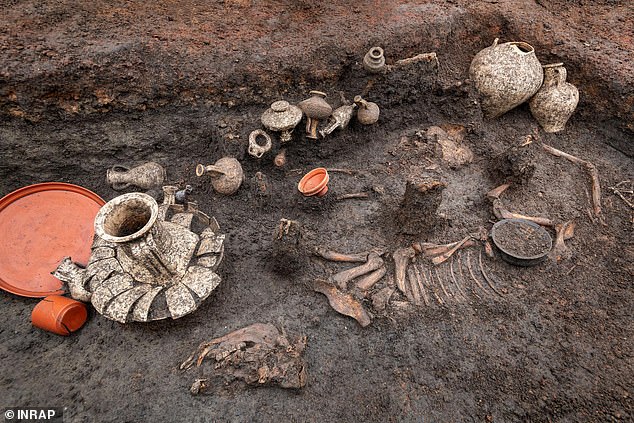 Также был обнаружен молочный зуб, возможно, принадлежащий старшему брату или сестре. В основании гроба был найден скелет щенка с ошейником с бронзовыми украшениями и маленьким колокольчиком. «Связь собаки с маленьким ребенком хорошо задокументирована в контексте похорон, но здесь необычны ошейник и колокольчик», - утверждают археологи. Они называют открытие «исключительным» и считают, что это самое старое детское захоронение, обнаруженное во Франции.Оно относится к периоду правления императора Августа (27 г. до н.э. - 14 г. н.э.) или Тиберия (14–37 г. н.э.), всего через десятилетия после рождения Иисуса. В Галлии римской эпохи - современной Франции, Бельгии и некоторых частях Западной Германии - взрослых кремировали, но детей часто хоронили на семейных землях. Главный археолог Лоуренс Лотье (Laurence Lautier) сказал, что огромное количество подношений, похороненных вместе с ребенком, было необычным. «В гробницах такого типа мы часто находим один или два горшка, поставленных у подножия», - сказал Лотье AFP. «Здесь около 20, а также много еды». По словам Лотье, это означает высокий социальный класс, «явно очень богатую семью». Источник: dailymail.co.uk