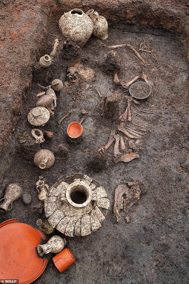 «Такое обилие посуды и предметов, а также личные вещи, которые сопровождали ребенка в могиле, подчеркивают привилегированный статус, к которому принадлежала его семья», - сообщает Национальный институт превентивных археологических исследований ( National Institute for Preventative Archaeological Research, INRAP). Место захоронения было обнаружено в декабре в рамках профилактических раскопок, проводимых INRAP перед строительством в аэропорту Клермон-Ферран. В могиле были обнаружены остатки деревянного гроба, окруженного жертвоприношениями животных, в том числе половиной свиньи и двумя безголовыми цыплятами. Двадцать терракотовых ваз и разные стеклянные горшки в могиле могли содержать лекарства, косметику или детскую часть поминального пира, в то время как исследователи считают, что железный обруч длиной в фут, прикрепленный к изогнутому металлическому стержню, был игрушкой или частью игры. .