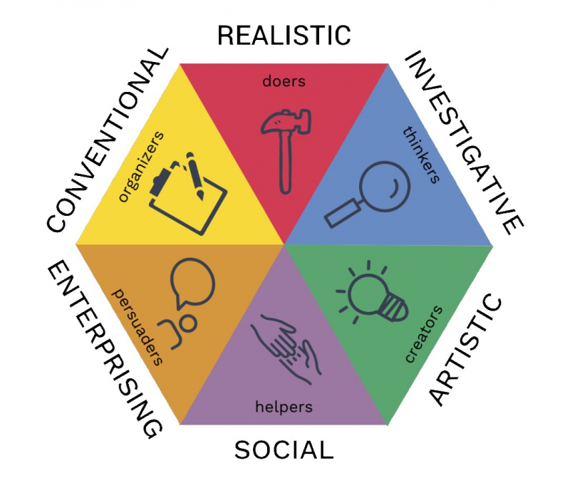 За основу ученые взяли так называемую шкалу RIASEC, разработанную американским психологом Джоном Х. Холландом. Он выделил шесть типов личности: Реалистический, Исследовательский, Артистический, Социальный, Предпринимательский, Конвенциональный. Принадлежность к профессиональному типу личности определяется после несложного психологического теста, где респонденту предлагается ответить на ряд вопросов о себе. При этом, если человек относится к реалистическому типу, это вовсе не значит, что он лишен артистизма или предприимчивости. Просто именно этот тип доминирует в его личностной организации. Как складывается профессиональный тип личности