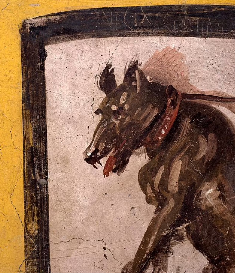 На фото: фреска с изображением большой собаки на поводке внутри Помпейского термополия.