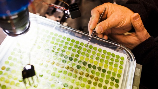 Анна Андерхилл, технический специалист отдела генетических исследований винограда USDA-ARS в Женеве, Нью-Йорк, калибрует лоток для дисков с листьями в роботе для визуализации BlackBird. Эта система может снимать образцы с 351 виноградной лозы за два часа. Изображение: источника. Биолог Лэнс Кэдл-Дэвидсон (Lance Cadle-Davidson), доктор наук, адъюнкт-профессор Школы интегративных наук о растениях (School of Integrative Plant Science, SIPS), работает над созданием сортов винограда, более устойчивых к Мучнистой росе, но исследования его лаборатории были затруднены из-за необходимости вручную оценить тысячи образцов виноградных листьев для получения доказательств инфекции. Мучнистая роса, грибок, поражающий многие растения, в том числе винный и столовый виноград, оставляет болезненные белые споры на листьях и фруктах и ежегодно обходится производителям винограда во всем мире в миллиарды долларов в виде потерянного урожая и затрат на фунгициды. Кэдл-Дэвидсон также является патологом растений в Службе сельскохозяйственных исследований Министерства сельского хозяйства США (USDA-ARS). Вместе с командой ученых Лэнс Кэдл-Дэвидсон разработал прототипы роботов для визуализации, которые могут автоматически сканировать образцы виноградных листьев.