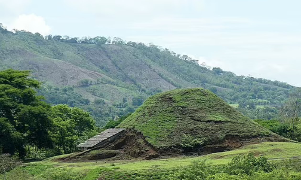 На фото источника: пирамида Кампана на участке Сан-Андрес в долине Сапотитан, на заднем плане - вулканический комплекс Сан-Сальвадор, за которым находится озеро Илопанго. Извержение вулкана Илопанго (ныне кратерное озеро) на Огненной Земле в 539 г. н.э. было крупнейшим в Центральной Америке за последние 10 000 лет. Археолог Акира Итикава (Akira Ichikawa) из Университета Колорадо Боулдере (University of Colorado Boulder) изучал пирамиду Кампана в Сан-Андресе, в долине Сапотитан, в 40 км от Илопанго. Его анализ показал, что структура была построена из тефры в результате извержения всего через 5–30 лет после разрушительного события и завершена в течение 80 лет. Время строительство предполагает, что пирамида была построена в ответ на извержение вулкана, который, как отметил доктор Итикава, был священным в мезоамериканском мировоззрении.