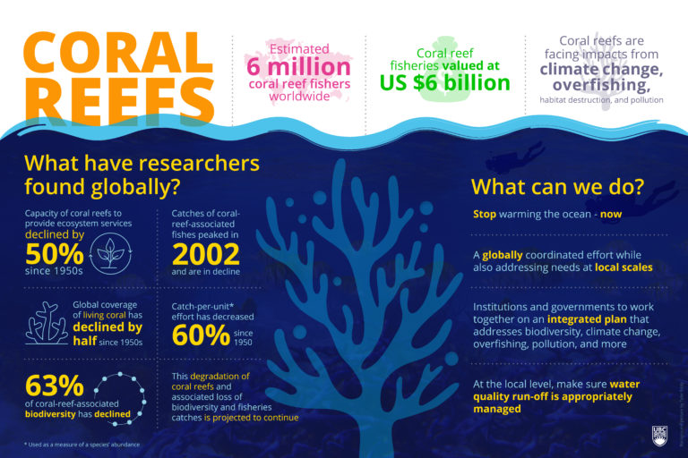 Изображение: доктор Тайлер Эдди. В исследовании представлен всесторонний взгляд на то, что изменение климата, истощение рыбных запасов и среды обитания разрушения коралловых рифов означает что способность рифов удовлетворить потребности людей, в том числе продуктов питания, средств к существованию, а также защиту от штормов, уменьшилась в два раза с 1950-х годов. Другие результаты столь же мрачны: авторы обнаружили, что глобальный охват живыми кораллами сократился примерно наполовину с 1950-х годов, следовательно, разнообразие видов также уменьшилось более чем на 60 процентов.