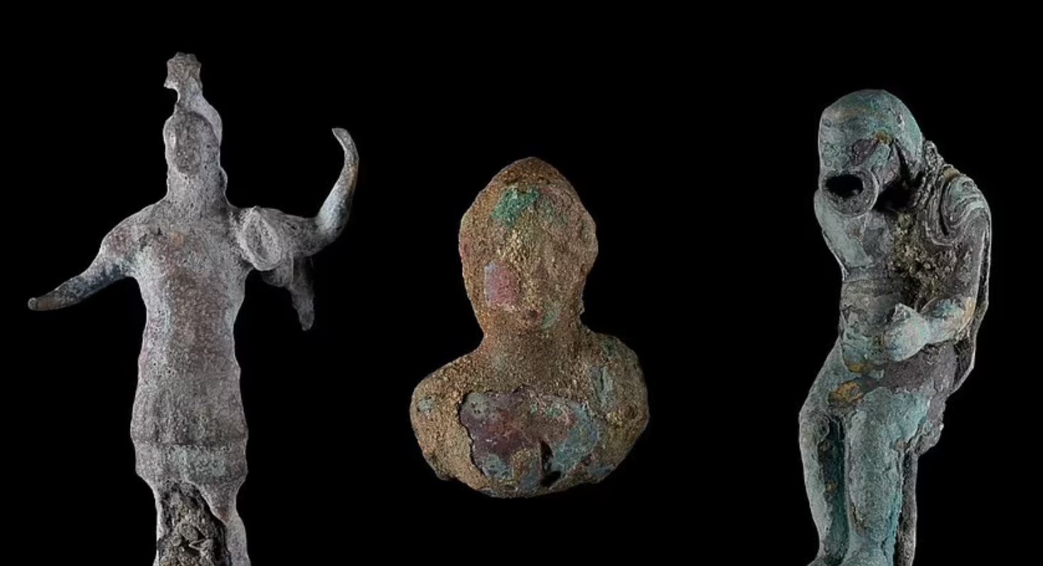 Кольцо, которому 1700 лет, было найдено среди кладова римских монет III века, а также бронзовой фигурки орла, колокольчиков для отпугивания злых духов, керамики и римской фигурки пантомима в комической маске (на фото) Источник: dailymail.co.uk
