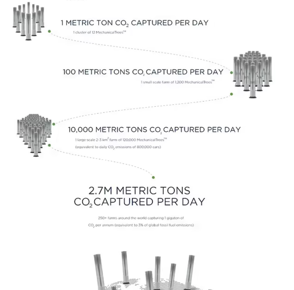 Изображение: источника. Разработанные Клаусом Лакнером (Klaus Lackner), профессором инженерии Университета штата Аризоны (Arizona State University), «деревья» в тысячи раз более эффективны, чем природные разновидности. Механическое дерево представляет собой, высокую вертикальную колонну дисков, каждый около 5 футов (1,52м) в диаметре. Диски расположены и на расстоянии двух дюймов (0,2м) друг от друга, покрыты химической смолой и размещены как стопка виниловых пластинок. Эта смола улавливает CO2 из воздуха, после заполнения она попадает в бочку, где CO2 испаряется и помещается в закрытую среду. Далее, СО2 (углекислый газ) можно использовать для производства синтетического топлива, которое затем можно использовать в самолетах, что снижает спрос на нефть и газ. Профессор Лакнер планирует создать три крупных механических фермы по выращиванию деревьев, первая из которых должна открыться в Аризоне в конце этого года. Как только все три будут введены в эксплуатацию, они смогут поглощать 1000 тонн CO2 в день, что считается важным шагом в балансировании мирового углеродного баланса.