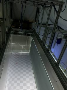Изображение испытательной камеры и компьютерная система слежения в режиме реального времени, используемая для проверки реакции летающих комаров на различные визуальные объекты, такие как цветные точки у основания камеры.