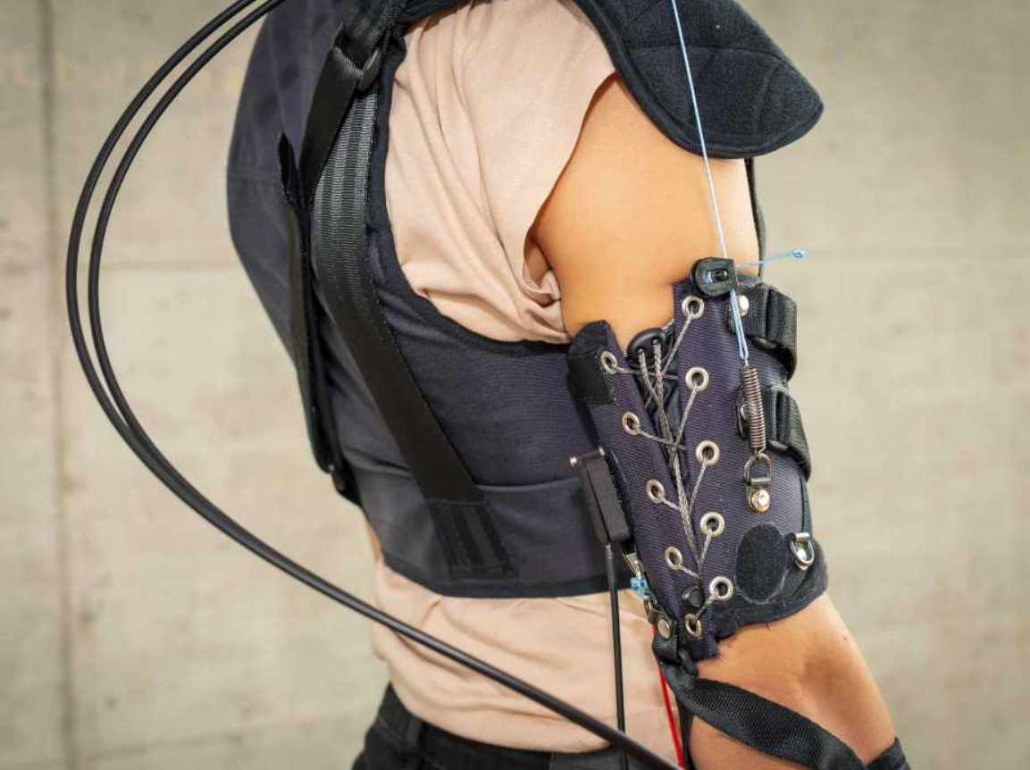 Изображение: источника. Ученые создали Myoshirt: мягкий, удобный для носки экзомускул для верхней части тела. Это своего рода жилет с манжетами для плеч, сопровождаемый небольшой коробкой, содержащей все технологии, которые не используются непосредственно на теле. Работая с датчиками, встроенными в ткань, интеллектуальный алгоритм определяет преднамеренные движения владельца и необходимое усилие. Затем двигатель укорачивает кабель в ткани, идущий параллельно мышцам пользователя — своего рода искусственное сухожилие — и таким образом поддерживает желаемое движение. Эта помощь всегда соответствует движениям пользователя и может быть адаптирована к его индивидуальным предпочтениям. Пользователь всегда находится под контролем и может отключить устройство в любое время.