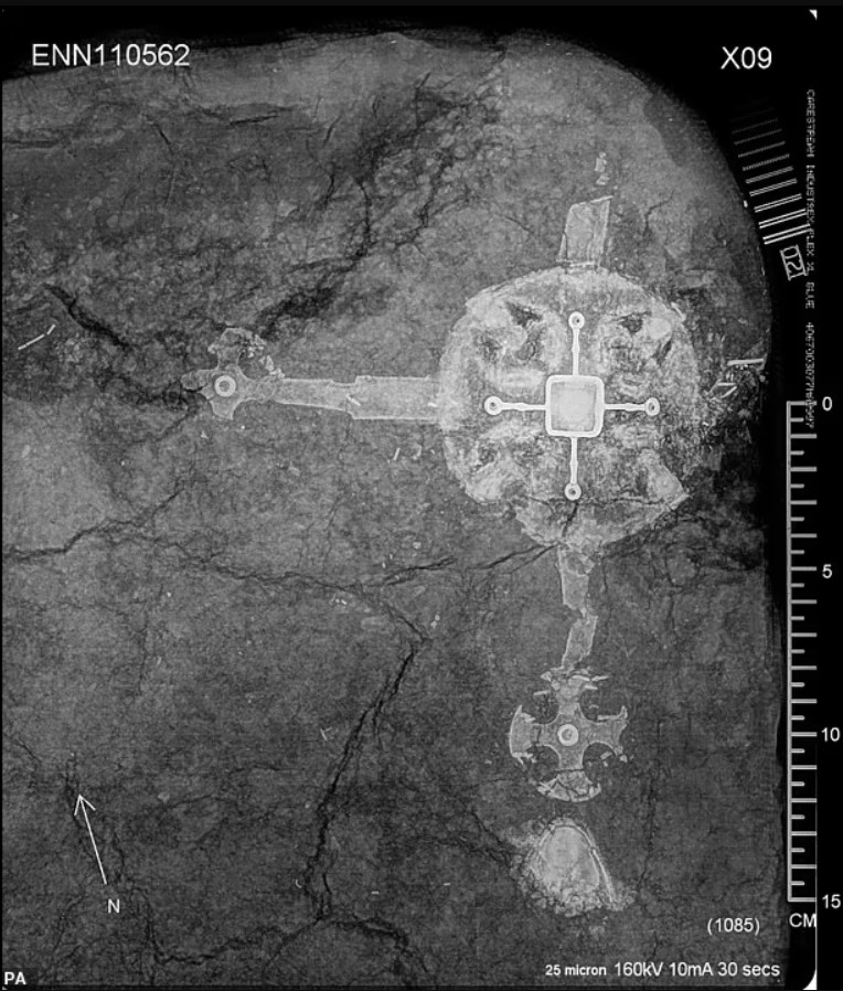 Используя рентгеновскую технологию, команда также обнаружила в могиле два украшенных горшка, неглубокое медное блюдо и большой искусно украшенный крест (на фото источника).