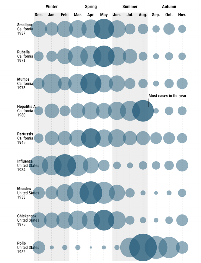 Миф 9: все станет лучше летом, когда погода прогреется. Хотя это верно для гриппа, заболеваемость которым снижается в течение летних месяцев, мы пока не знаем, будет ли это так же для коронавируса. Некоторые заболевания меняются в зависимости от сезона, некоторые заболевания зависят от температуры, а некоторые в значительной степени зависят от сезонного поведения человека. Некоторые заболевания не меняются в зависимости от сезона. Чтобы еще больше усложнить ситуацию, коронавирус - это совершенно новый вирус, а это означает, что у людей еще нет иммунитета к нему. Таким образом, даже если это сезонный период, распространенность может продолжать расти независимо от сезонности, поскольку она поражает больше населения. Календарь эпидемий:
